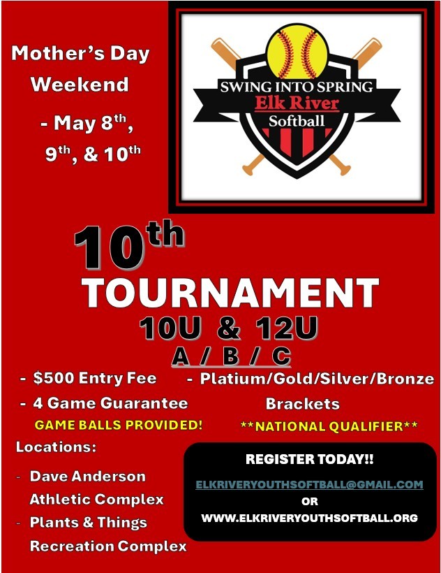The Elk River Youth Softball Association Swing into Spring Tournament is held annually on Mothers Day Weekend. The tournament brings teams from the metro area and surrounding states. ERYSA teams are strongly encouraged to participate. Games will be played at Plants and Things Recreation Complex and Dave Anderson Athletic Complex. This is a big weekend for ERYSA and our athletes. We have a reputation of hosting a competitive, efficient, and friendly tournament. It is an important fundraiser for the organization and requires the help of many volunteers. This is generally the best way to complete your Volunteer Hours for the season.