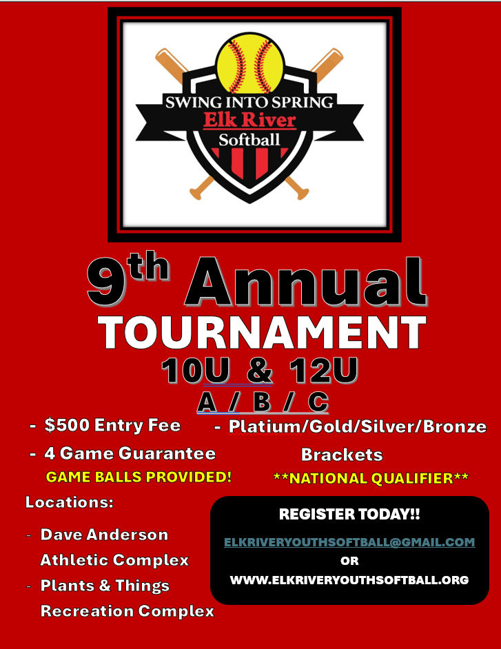 The Elk River Youth Softball Association Swing into Spring Tournament is held annually on Mothers Day Weekend. The tournament brings teams from the metro area and surrounding states. ERYSA teams are strongly encouraged to participate. Games will be played at Plants and Things Recreation Complex and Dave Anderson Athletic Complex. This is a big weekend for ERYSA and our athletes. We have a reputation of hosting a competitive, efficient, and friendly tournament. It is an important fundraiser for the organization and requires the help of many volunteers. This is generally the best way to complete your Volunteer Hours for the season.